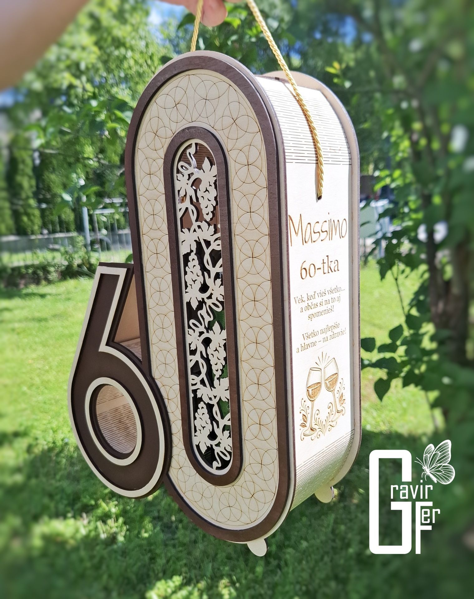 Originálny drevený darčekový box na víno k 60. narodeninám vyrobený z 3 mm preglejky. Elegantné spracovanie, výrazné číslo 60 a možnosť personalizovaného venovania robia z tohto boxu krásny a nezabudnuteľný darček k významnému jubileu.