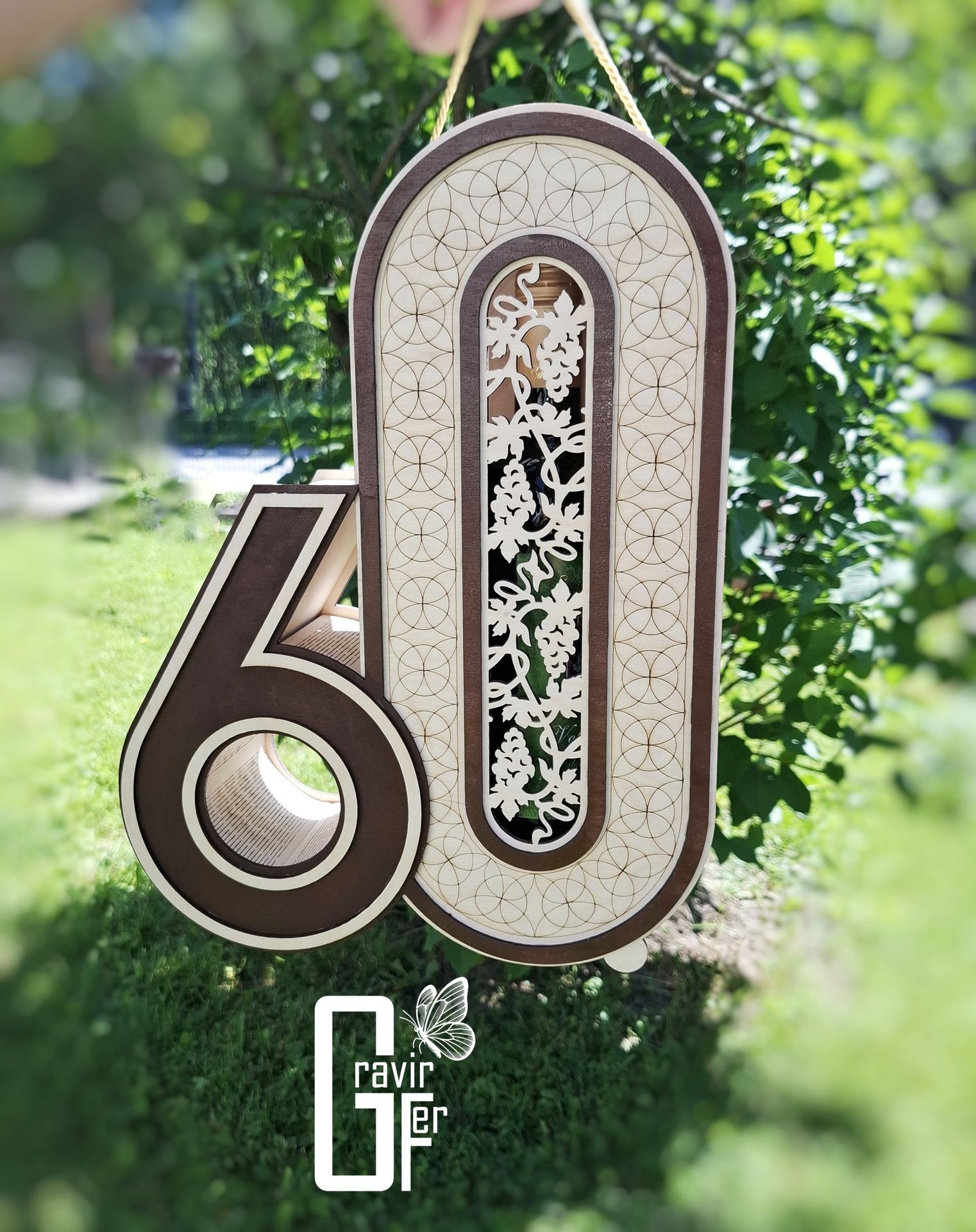 Elegantný a originálny darčekový box na víno k 60. narodeninám je výnimočný spôsob, ako odovzdať fľašu vína štýlovo, osobne a s emóciou. Tento dekoratívny box je vyrobený z drevenej preglejky s hrúbkou 3 mm a zaujme precíznym spracovaním, výrazným číslom 60 a vkusnými vyrezávanými detailmi, ktoré mu dodávajú slávnostný a reprezentatívny vzhľad.