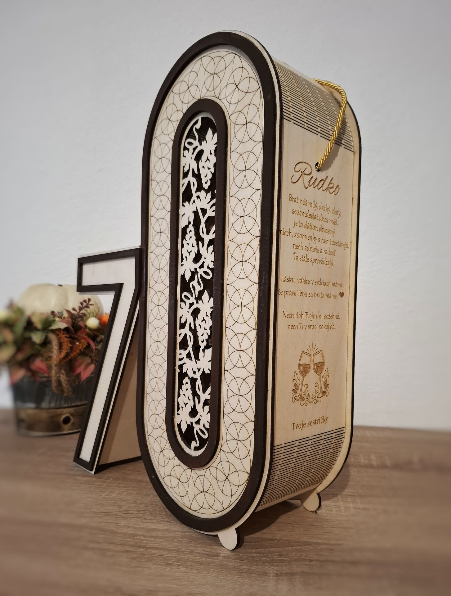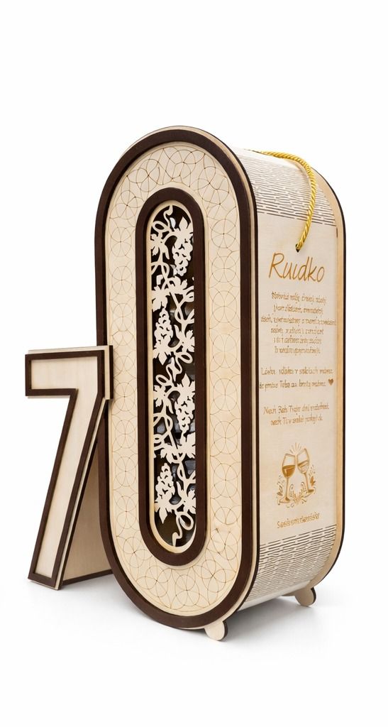 Originálny drevený darčekový box na víno k 70. narodeninám vyrobený z 3 mm preglejky. Elegantné spracovanie, výrazné číslo 70 a možnosť personalizovaného venovania robia z tohto boxu krásny a nezabudnuteľný darček k významnému jubileu.