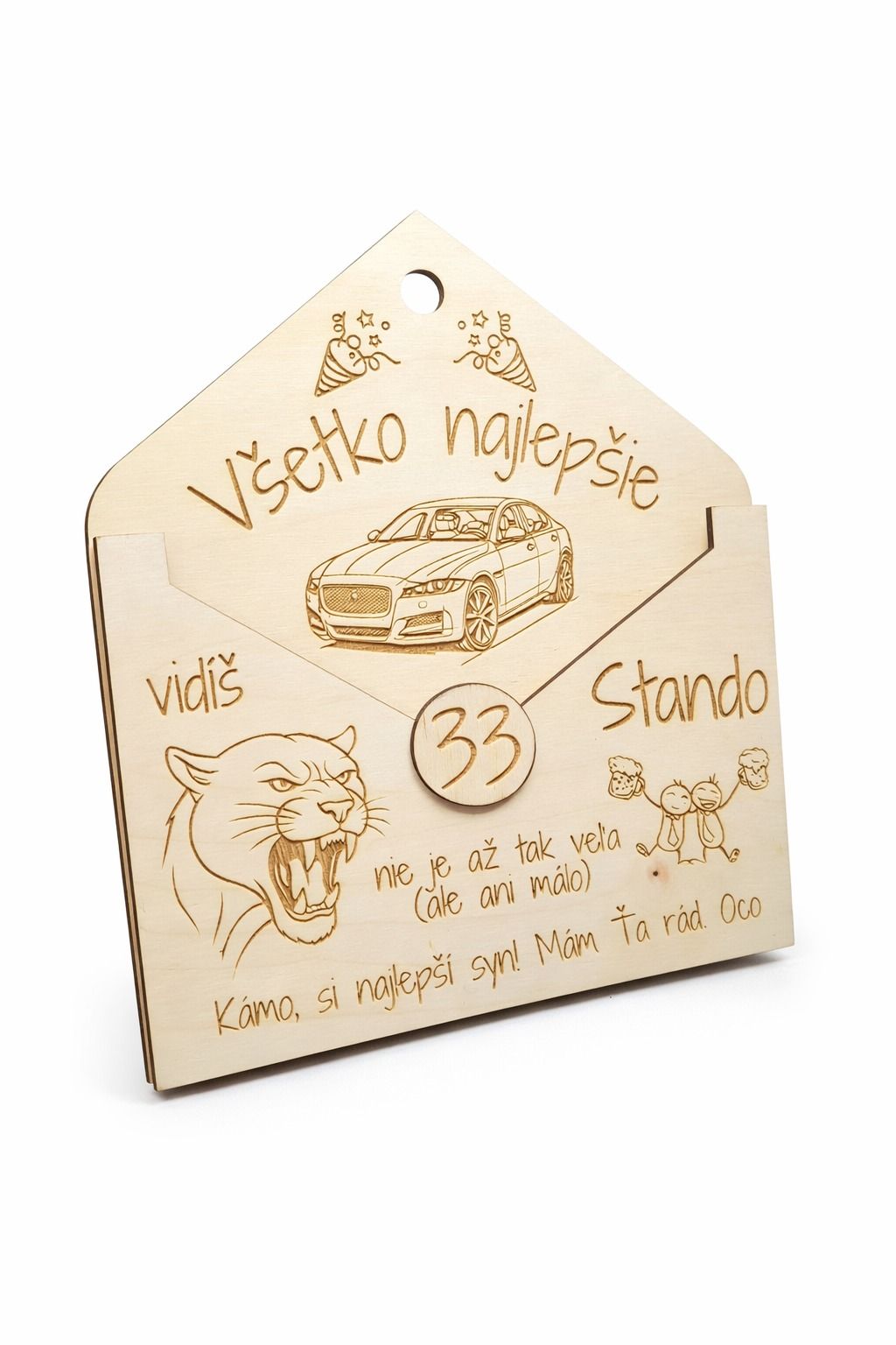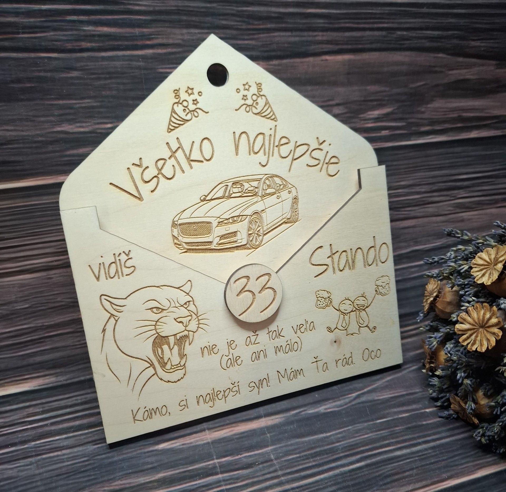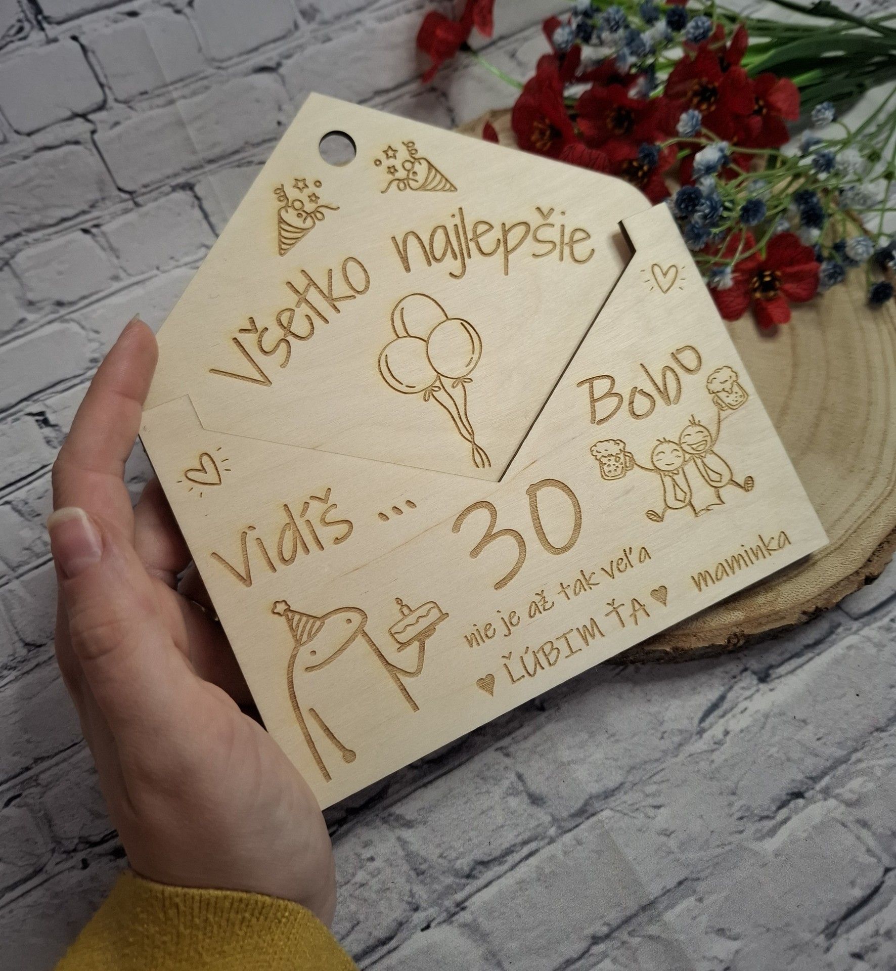 Hľadáte originálny spôsob, ako darovať peniaze k narodeninám štýlovo, osobne a s nápadom? Táto personalizovaná drevená obálka na peniaze k narodeninám je krásnou alternatívou ku klasickej papierovej obálke. Vďaka svojmu milému dizajnu, gravírovaným detailom a možnosti úpravy na mieru sa stáva nielen praktickým spôsobom odovzdania finančného daru, ale aj trvalou pamiatkou na výnimočný deň.